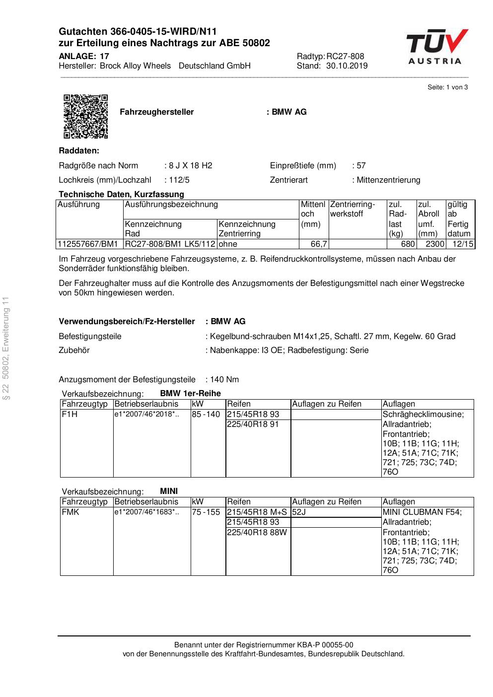 Dieses Gutachten (abe) bezieht sich auf die Alufelge Brock RC27-808 in der Ausführung 8Jx18 ET 0, Mittenloch 0 mm (KBA 50802). Im PDF findest du typischerweise zulässige Reifengrößen, Auflagen/Anbauhinweise und – je nach Dokument – Hinweise zur Eintragung.