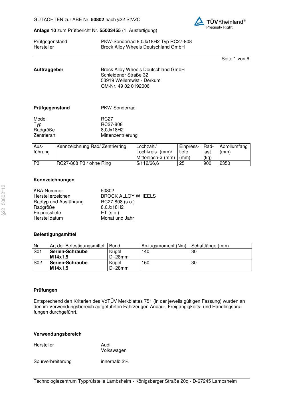 Felgengutachten / abe für Alufelgen Brock RC27-808 (8Jx18 ET 0, Mittenloch 0 mm) mit KBA 50802 (Zertifikatsnummer 50802). Hier kostenlos als PDF herunterladen. Der Download-Link ist 24 Stunden gültig und kann bis zu zwei Mal verwendet werden.