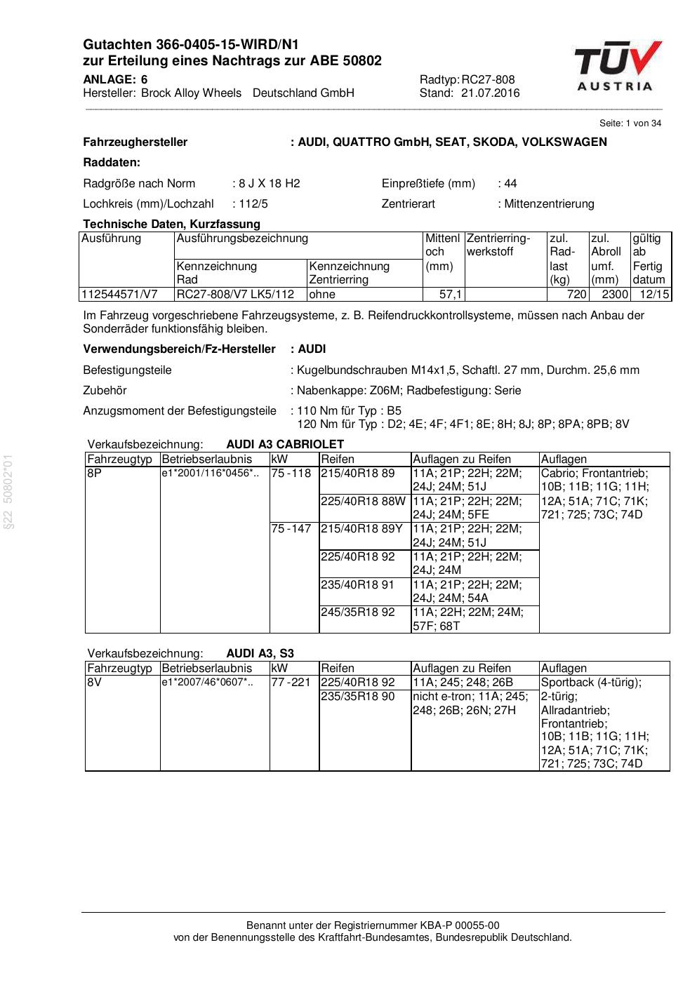 Dieses Gutachten (abe) bezieht sich auf die Alufelge Brock RC27-808 in der Ausführung 8Jx18 ET 0, Mittenloch 0 mm (KBA 50802). Im PDF findest du typischerweise zulässige Reifengrößen, Auflagen/Anbauhinweise und – je nach Dokument – Hinweise zur Eintragung.