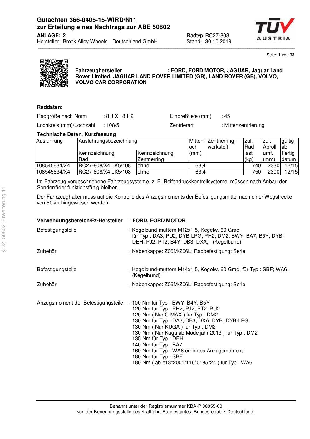Dieses Gutachten (abe) bezieht sich auf die Alufelge Brock RC27-808 in der Ausführung 8Jx18 ET 0, Mittenloch 0 mm (KBA 50802). Im PDF findest du typischerweise zulässige Reifengrößen, Auflagen/Anbauhinweise und – je nach Dokument – Hinweise zur Eintragung.