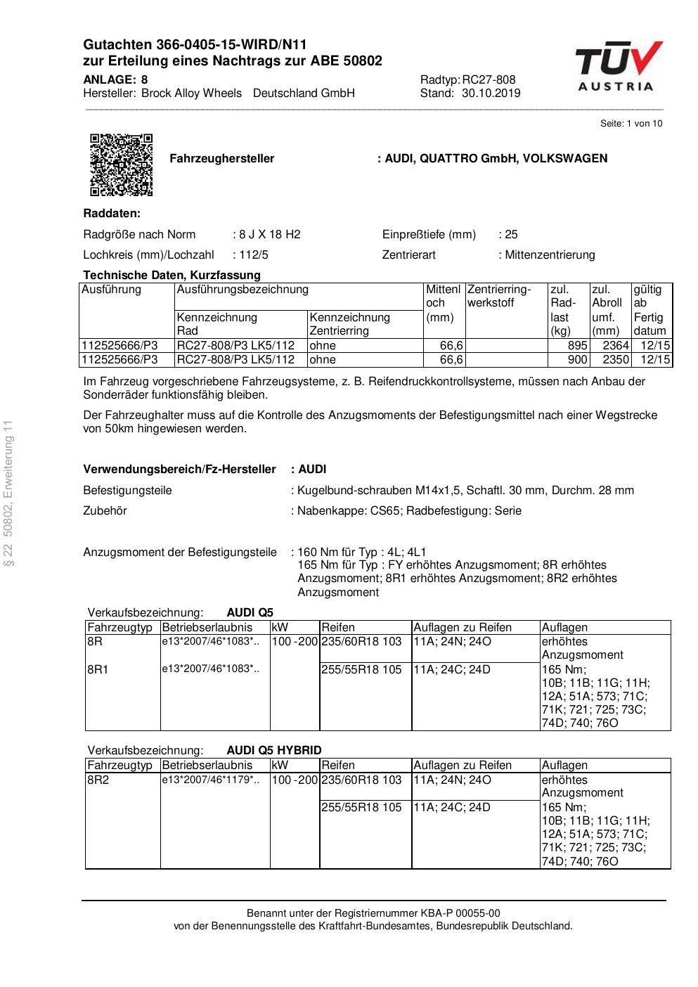 Dieses Gutachten (abe) bezieht sich auf die Alufelge Brock RC27-808 in der Ausführung 8Jx18 ET 0, Mittenloch 0 mm (KBA 50802). Im PDF findest du typischerweise zulässige Reifengrößen, Auflagen/Anbauhinweise und – je nach Dokument – Hinweise zur Eintragung.