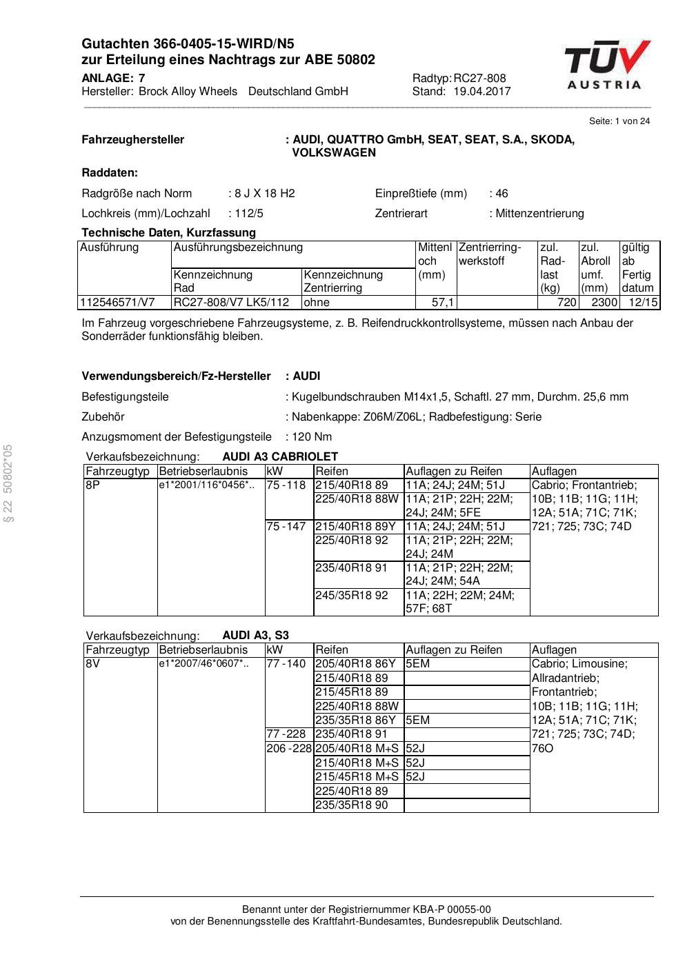 Dieses Gutachten (abe) bezieht sich auf die Alufelge Brock RC27-808 in der Ausführung 8Jx18 ET 0, Mittenloch 0 mm (KBA 50802). Im PDF findest du typischerweise zulässige Reifengrößen, Auflagen/Anbauhinweise und – je nach Dokument – Hinweise zur Eintragung.