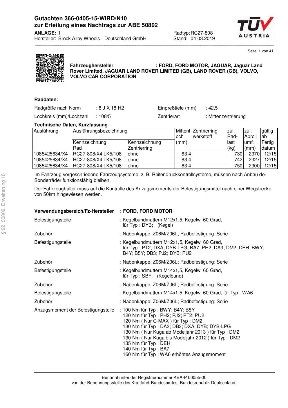 Dieses Gutachten (abe) bezieht sich auf die Alufelge Brock RC27-808 in der Ausführung 8Jx18 ET 0, Mittenloch 0 mm (KBA 50802). Im PDF findest du typischerweise zulässige Reifengrößen, Auflagen/Anbauhinweise und – je nach Dokument – Hinweise zur Eintragung.