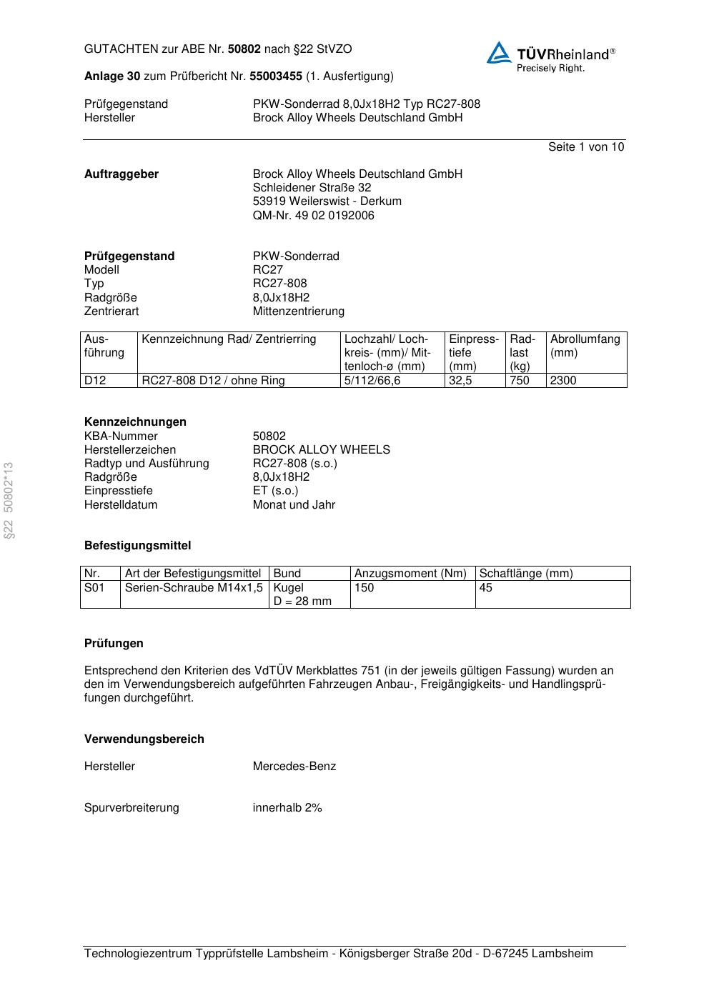 Felgengutachten / abe für Alufelgen Brock RC27-808 (8Jx18 ET 0, Mittenloch 0 mm) mit KBA 50802 (Zertifikatsnummer 50802). Hier kostenlos als PDF herunterladen. Der Download-Link ist 24 Stunden gültig und kann bis zu zwei Mal verwendet werden.