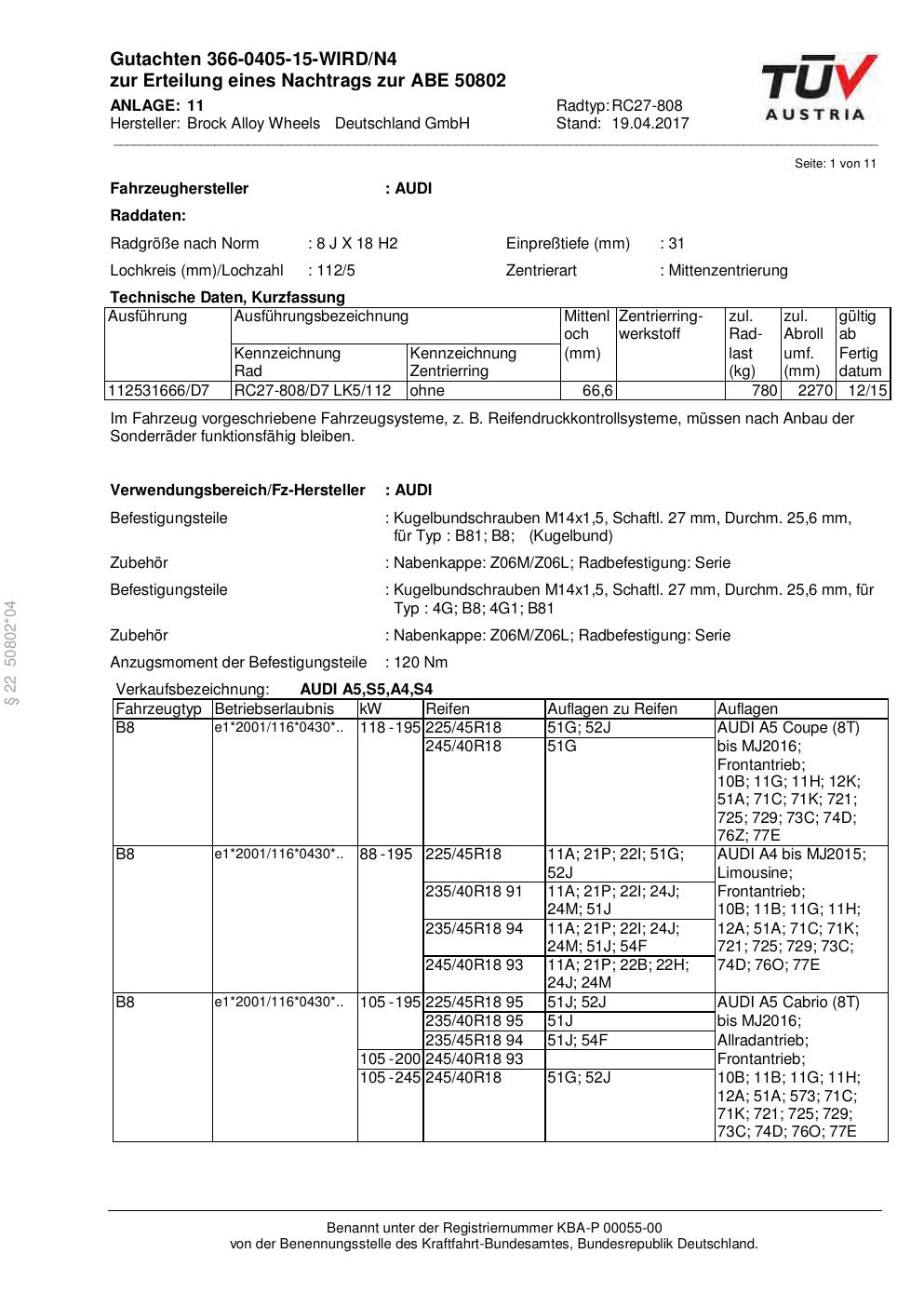 Dieses Gutachten (abe) bezieht sich auf die Alufelge Brock RC27-808 in der Ausführung 8Jx18 ET 0, Mittenloch 0 mm (KBA 50802). Im PDF findest du typischerweise zulässige Reifengrößen, Auflagen/Anbauhinweise und – je nach Dokument – Hinweise zur Eintragung.