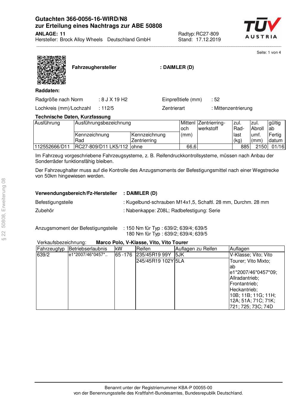 Dieses Gutachten (abe) bezieht sich auf die Alufelge Brock RC27-809 in der Ausführung 8Jx19 ET 0, Mittenloch 0 mm (KBA 50808). Im PDF findest du typischerweise zulässige Reifengrößen, Auflagen/Anbauhinweise und – je nach Dokument – Hinweise zur Eintragung.