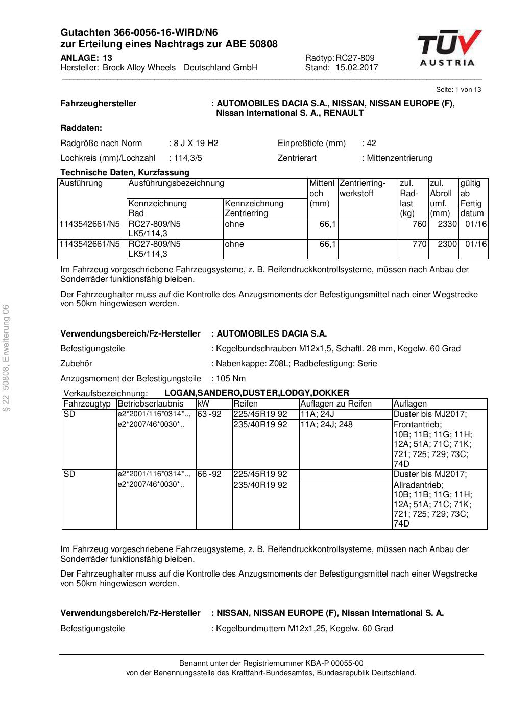 Dieses Gutachten (abe) bezieht sich auf die Alufelge Brock RC27-809 in der Ausführung 8Jx19 ET 0, Mittenloch 0 mm (KBA 50808). Im PDF findest du typischerweise zulässige Reifengrößen, Auflagen/Anbauhinweise und – je nach Dokument – Hinweise zur Eintragung.