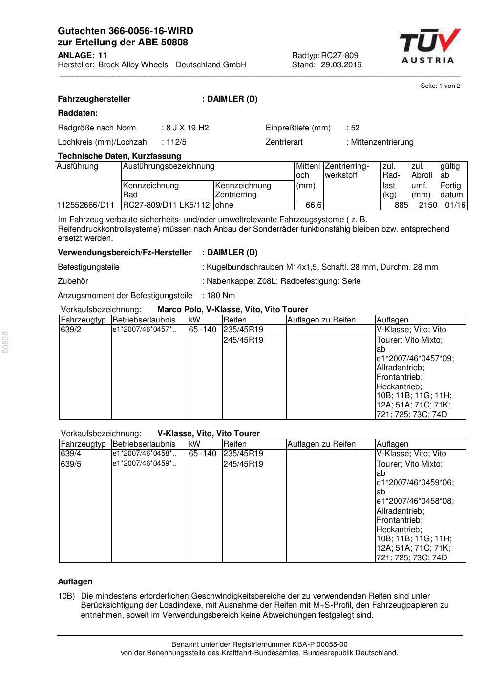 Dieses Gutachten (abe) bezieht sich auf die Alufelge Brock RC27-809 in der Ausführung 8Jx19 ET 0, Mittenloch 0 mm (KBA 50808). Im PDF findest du typischerweise zulässige Reifengrößen, Auflagen/Anbauhinweise und – je nach Dokument – Hinweise zur Eintragung.
