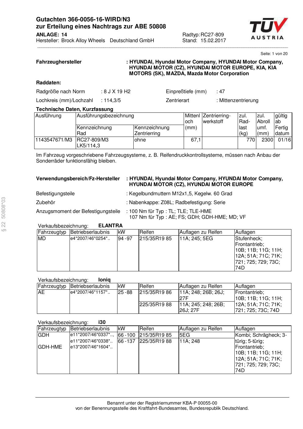 Dieses Gutachten (abe) bezieht sich auf die Alufelge Brock RC27-809 in der Ausführung 8Jx19 ET 0, Mittenloch 0 mm (KBA 50808). Im PDF findest du typischerweise zulässige Reifengrößen, Auflagen/Anbauhinweise und – je nach Dokument – Hinweise zur Eintragung.