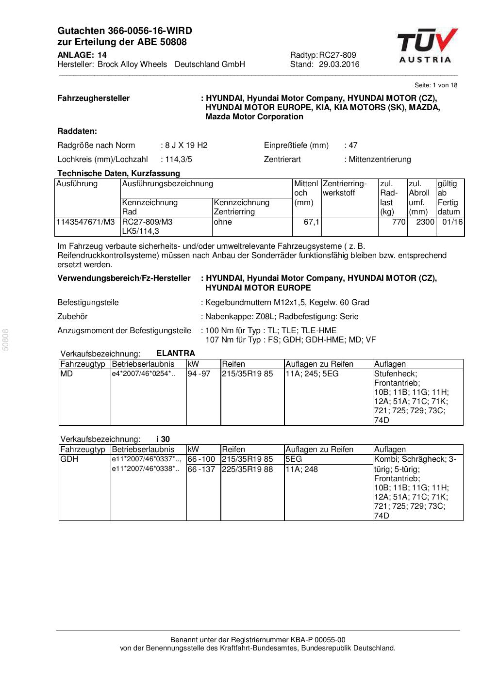 Dieses Gutachten (abe) bezieht sich auf die Alufelge Brock RC27-809 in der Ausführung 8Jx19 ET 0, Mittenloch 0 mm (KBA 50808). Im PDF findest du typischerweise zulässige Reifengrößen, Auflagen/Anbauhinweise und – je nach Dokument – Hinweise zur Eintragung.