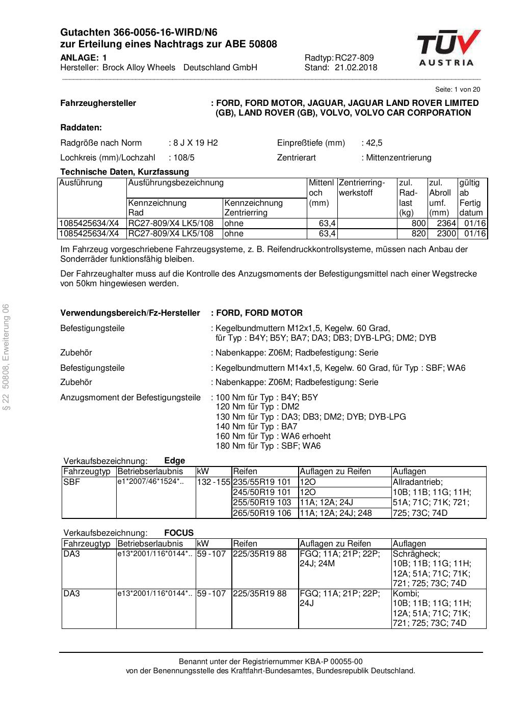 Dieses Gutachten (abe) bezieht sich auf die Alufelge Brock RC27-809 in der Ausführung 8Jx19 ET 0, Mittenloch 0 mm (KBA 50808). Im PDF findest du typischerweise zulässige Reifengrößen, Auflagen/Anbauhinweise und – je nach Dokument – Hinweise zur Eintragung.