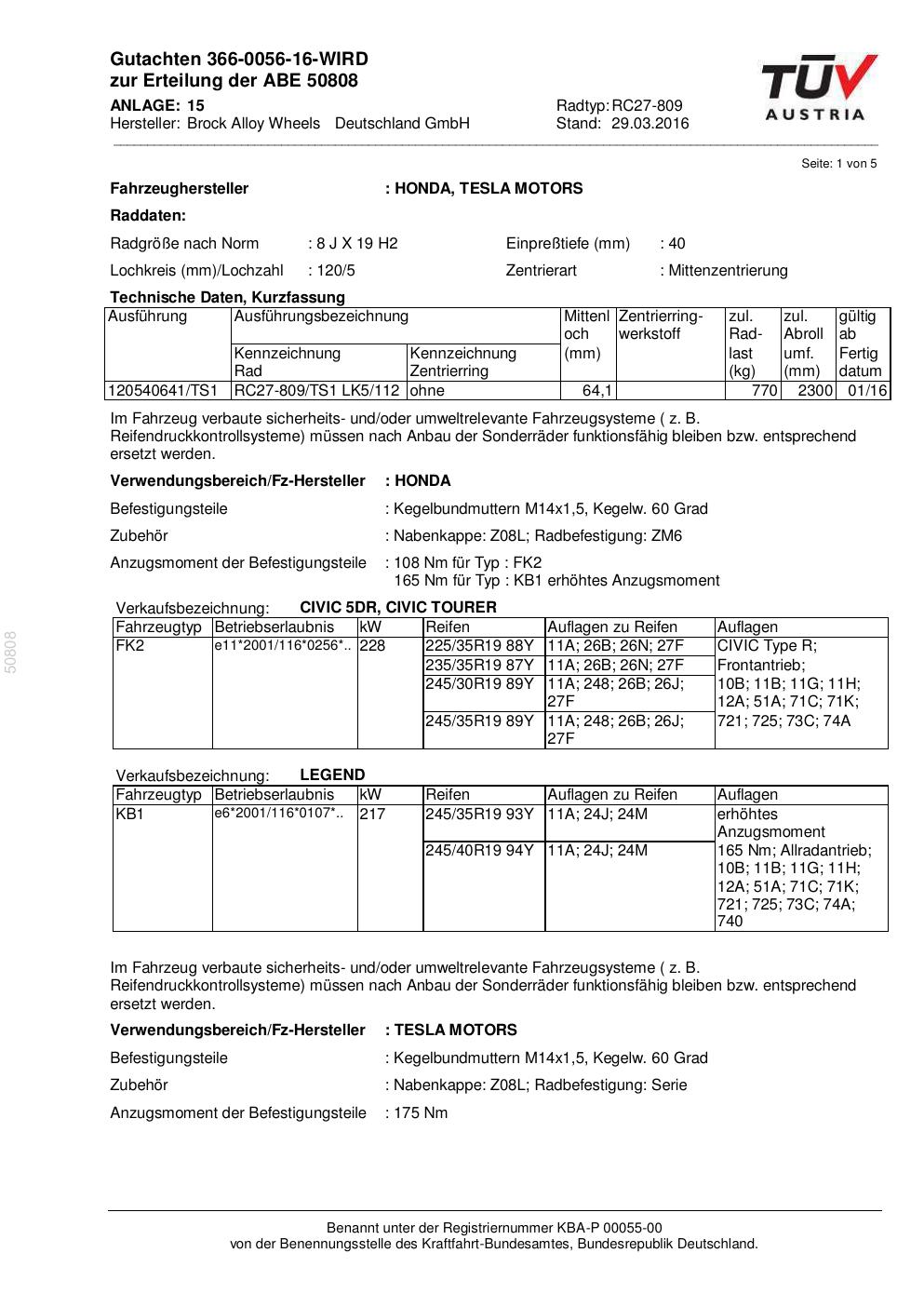 Dieses Gutachten (abe) bezieht sich auf die Alufelge Brock RC27-809 in der Ausführung 8Jx19 ET 0, Mittenloch 0 mm (KBA 50808). Im PDF findest du typischerweise zulässige Reifengrößen, Auflagen/Anbauhinweise und – je nach Dokument – Hinweise zur Eintragung.