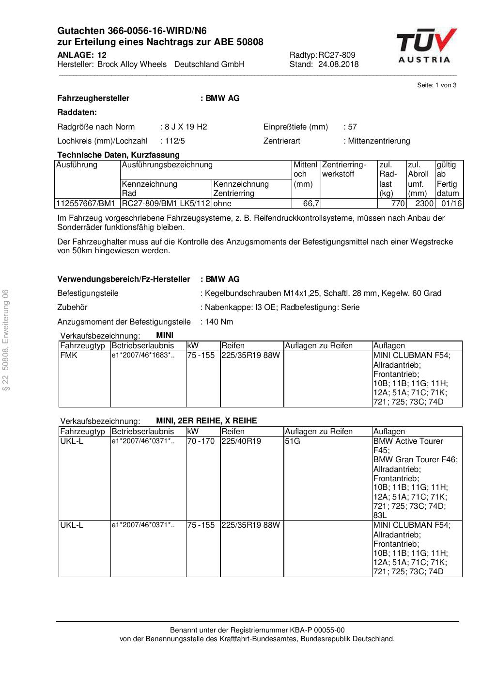 Dieses Gutachten (abe) bezieht sich auf die Alufelge Brock RC27-809 in der Ausführung 8Jx19 ET 0, Mittenloch 0 mm (KBA 50808). Im PDF findest du typischerweise zulässige Reifengrößen, Auflagen/Anbauhinweise und – je nach Dokument – Hinweise zur Eintragung.