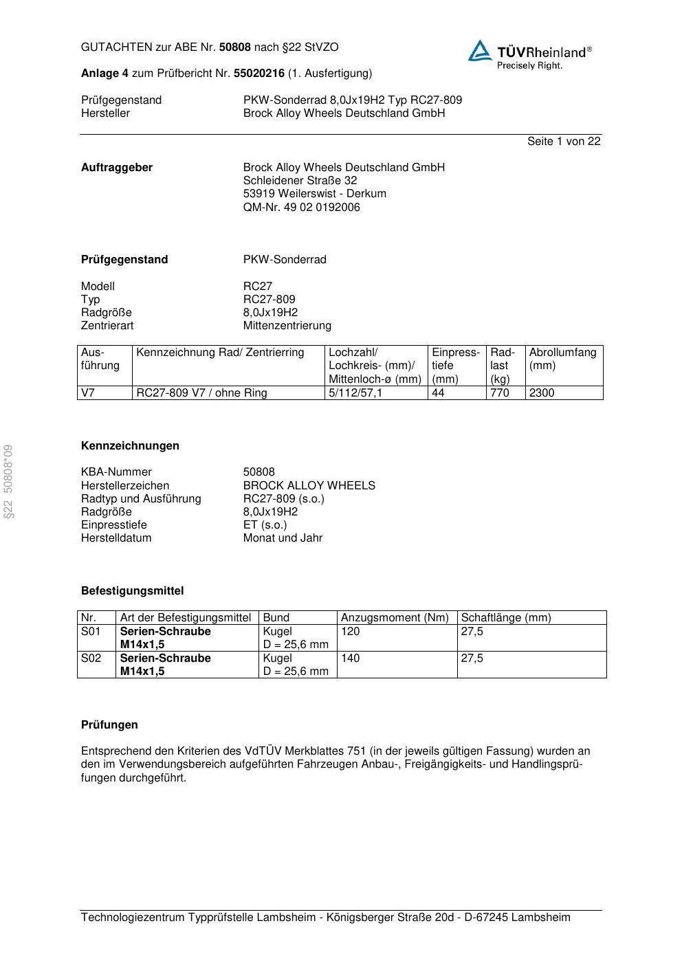 Felgengutachten / abe für Alufelgen Brock RC27-809 (8Jx19 ET 0, Mittenloch 0 mm) mit KBA 50808 (Zertifikatsnummer 50808). Hier kostenlos als PDF herunterladen. Der Download-Link ist 24 Stunden gültig und kann bis zu zwei Mal verwendet werden.