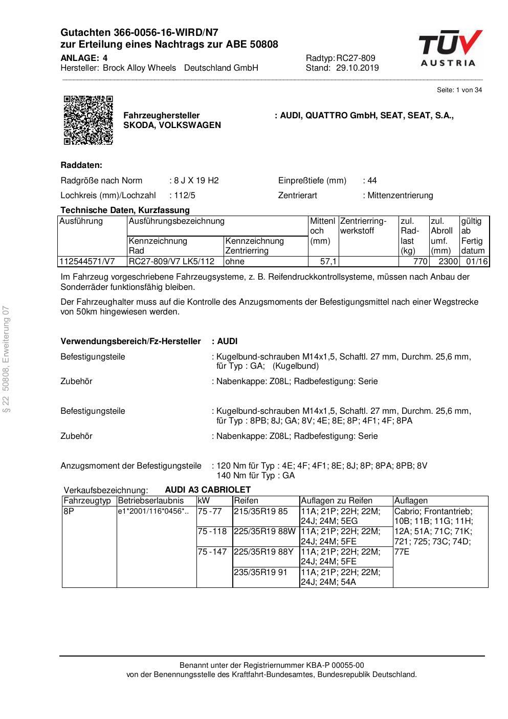 Dieses Gutachten (abe) bezieht sich auf die Alufelge Brock RC27-809 in der Ausführung 8Jx19 ET 0, Mittenloch 0 mm (KBA 50808). Im PDF findest du typischerweise zulässige Reifengrößen, Auflagen/Anbauhinweise und – je nach Dokument – Hinweise zur Eintragung.