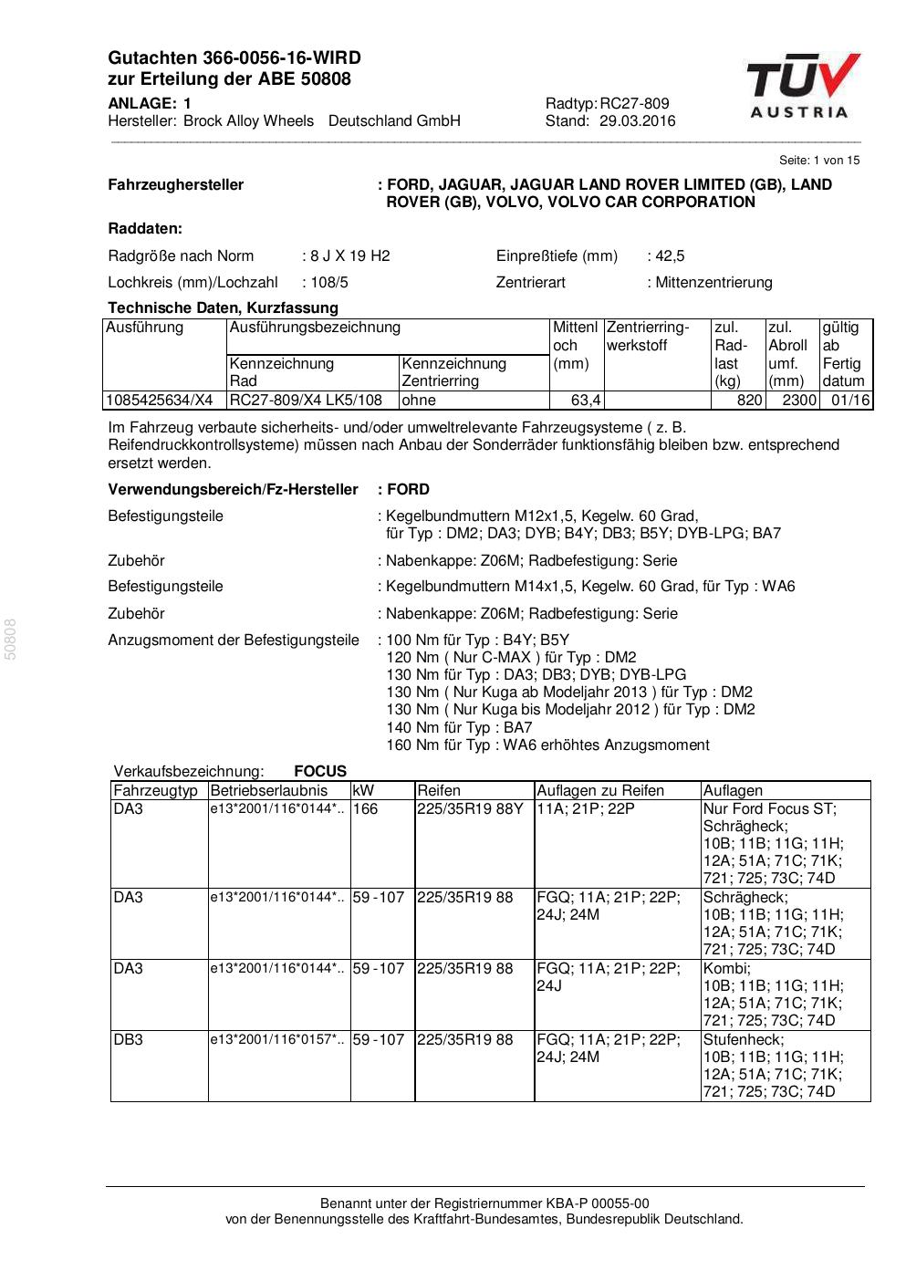 Dieses Gutachten (abe) bezieht sich auf die Alufelge Brock RC27-809 in der Ausführung 8Jx19 ET 0, Mittenloch 0 mm (KBA 50808). Im PDF findest du typischerweise zulässige Reifengrößen, Auflagen/Anbauhinweise und – je nach Dokument – Hinweise zur Eintragung.