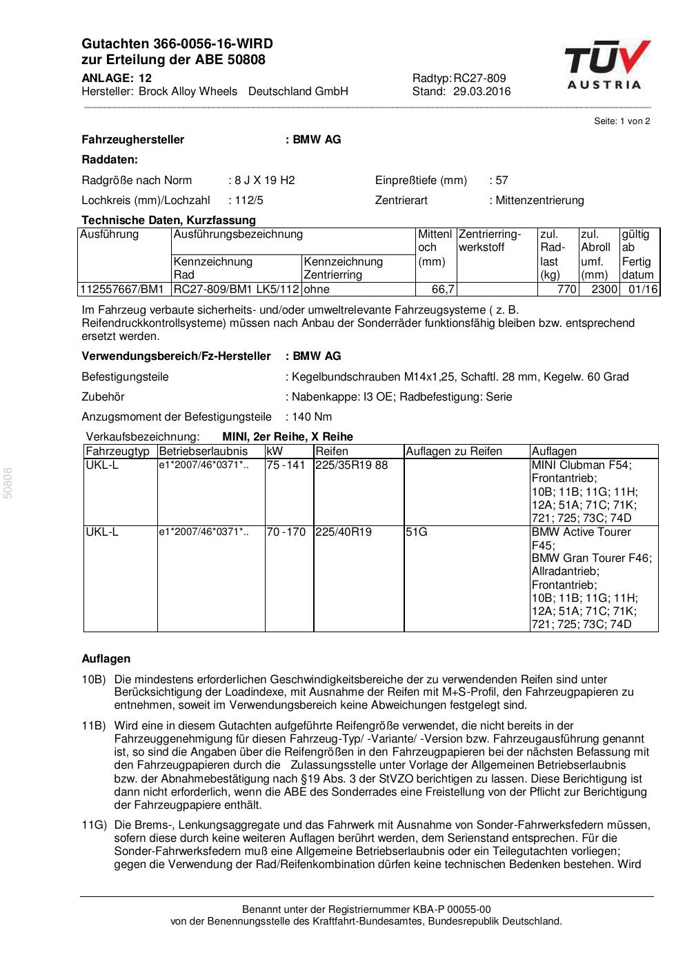 Dieses Gutachten (abe) bezieht sich auf die Alufelge Brock RC27-809 in der Ausführung 8Jx19 ET 0, Mittenloch 0 mm (KBA 50808). Im PDF findest du typischerweise zulässige Reifengrößen, Auflagen/Anbauhinweise und – je nach Dokument – Hinweise zur Eintragung.