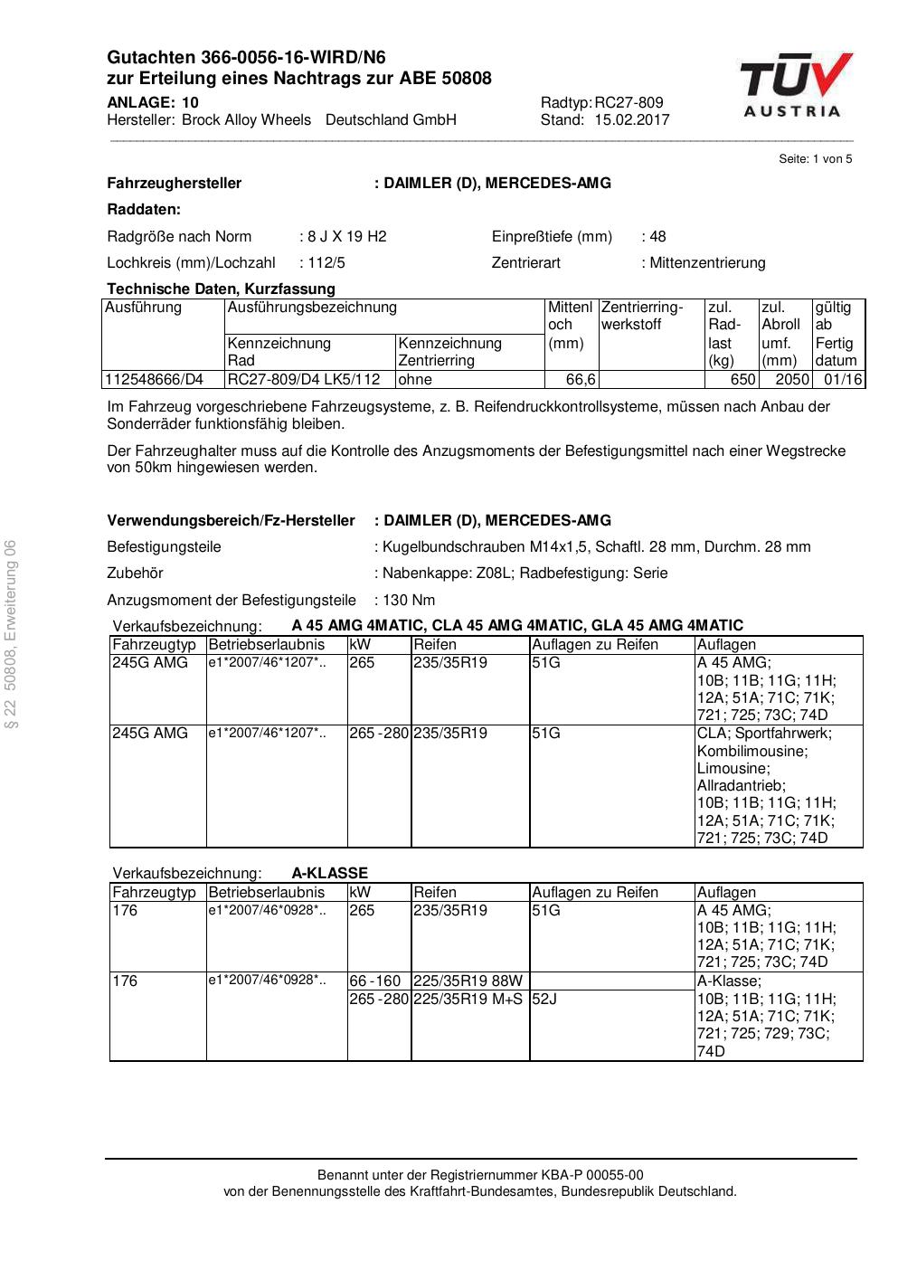 Dieses Gutachten (abe) bezieht sich auf die Alufelge Brock RC27-809 in der Ausführung 8Jx19 ET 0, Mittenloch 0 mm (KBA 50808). Im PDF findest du typischerweise zulässige Reifengrößen, Auflagen/Anbauhinweise und – je nach Dokument – Hinweise zur Eintragung.
