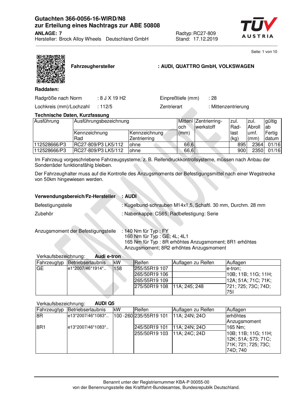 Dieses Gutachten (abe) bezieht sich auf die Alufelge Brock RC27 -809 in der Ausführung 8Jx19 ET 0, Mittenloch 0 mm (KBA 50808). Im PDF findest du typischerweise zulässige Reifengrößen, Auflagen/Anbauhinweise und – je nach Dokument – Hinweise zur Eintragung.
