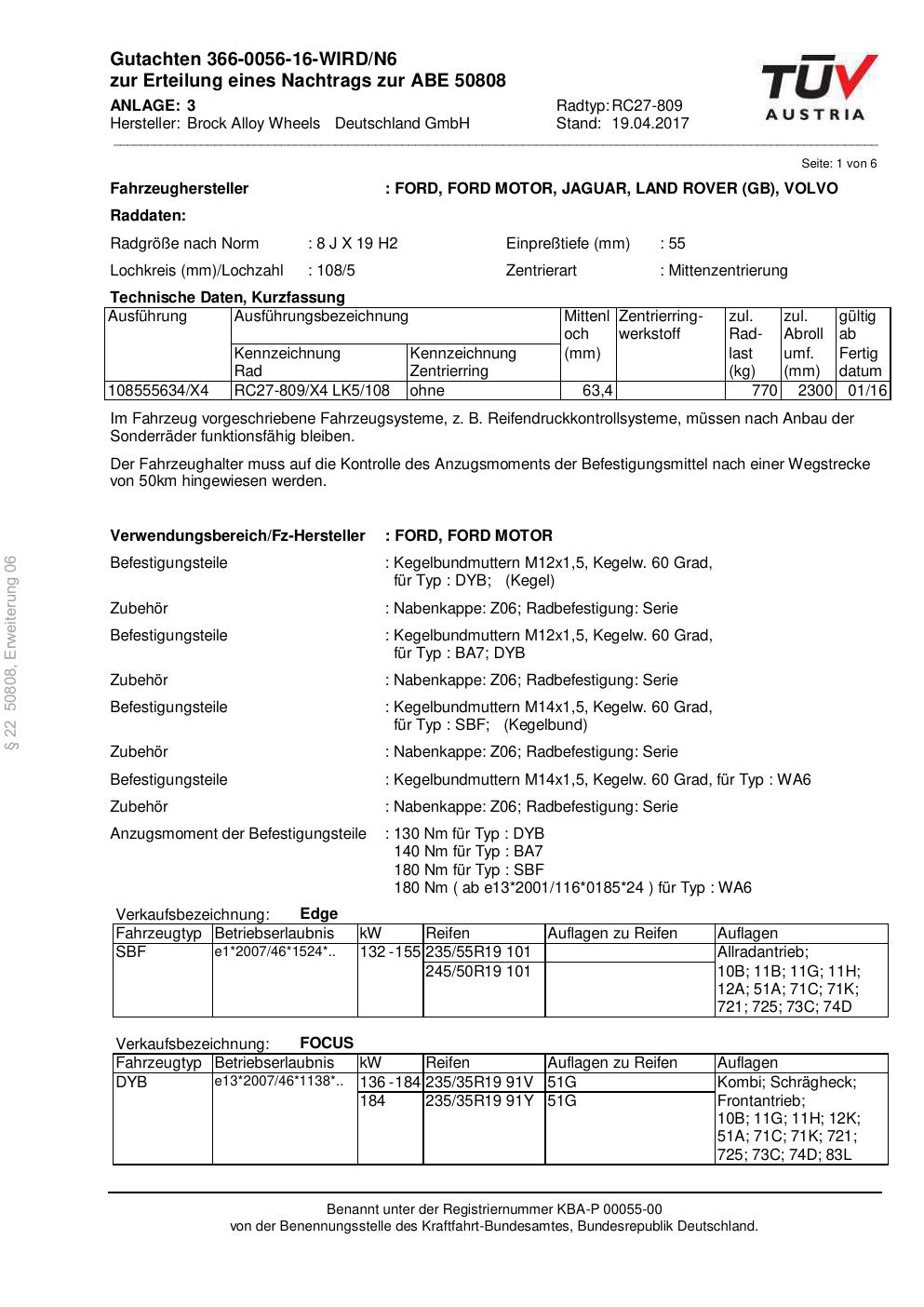 Dieses Gutachten (abe) bezieht sich auf die Alufelge Brock RC27-809 in der Ausführung 8Jx19 ET 0, Mittenloch 0 mm (KBA 50808). Im PDF findest du typischerweise zulässige Reifengrößen, Auflagen/Anbauhinweise und – je nach Dokument – Hinweise zur Eintragung.