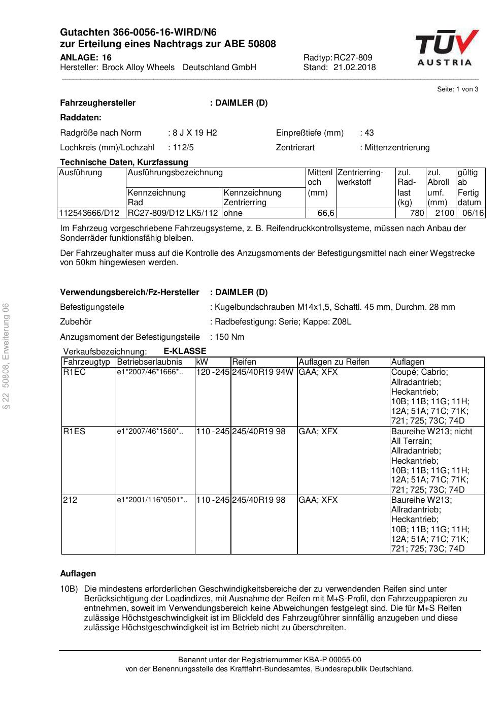 Felgengutachten / abe für Alufelgen Brock RC27-809 (8Jx19 ET 0, Mittenloch 0 mm) mit KBA 50808 (Zertifikatsnummer 50808). Hier kostenlos als PDF herunterladen. Der Download-Link ist 24 Stunden gültig und kann bis zu zwei Mal verwendet werden.