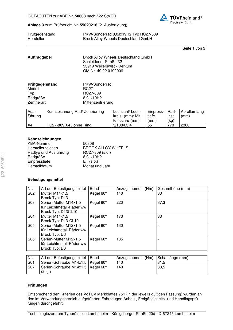 Dieses Gutachten (abe) bezieht sich auf die Alufelge Brock RC27-809 in der Ausführung 8Jx19 ET 0, Mittenloch 0 mm (KBA 50808). Im PDF findest du typischerweise zulässige Reifengrößen, Auflagen/Anbauhinweise und – je nach Dokument – Hinweise zur Eintragung.