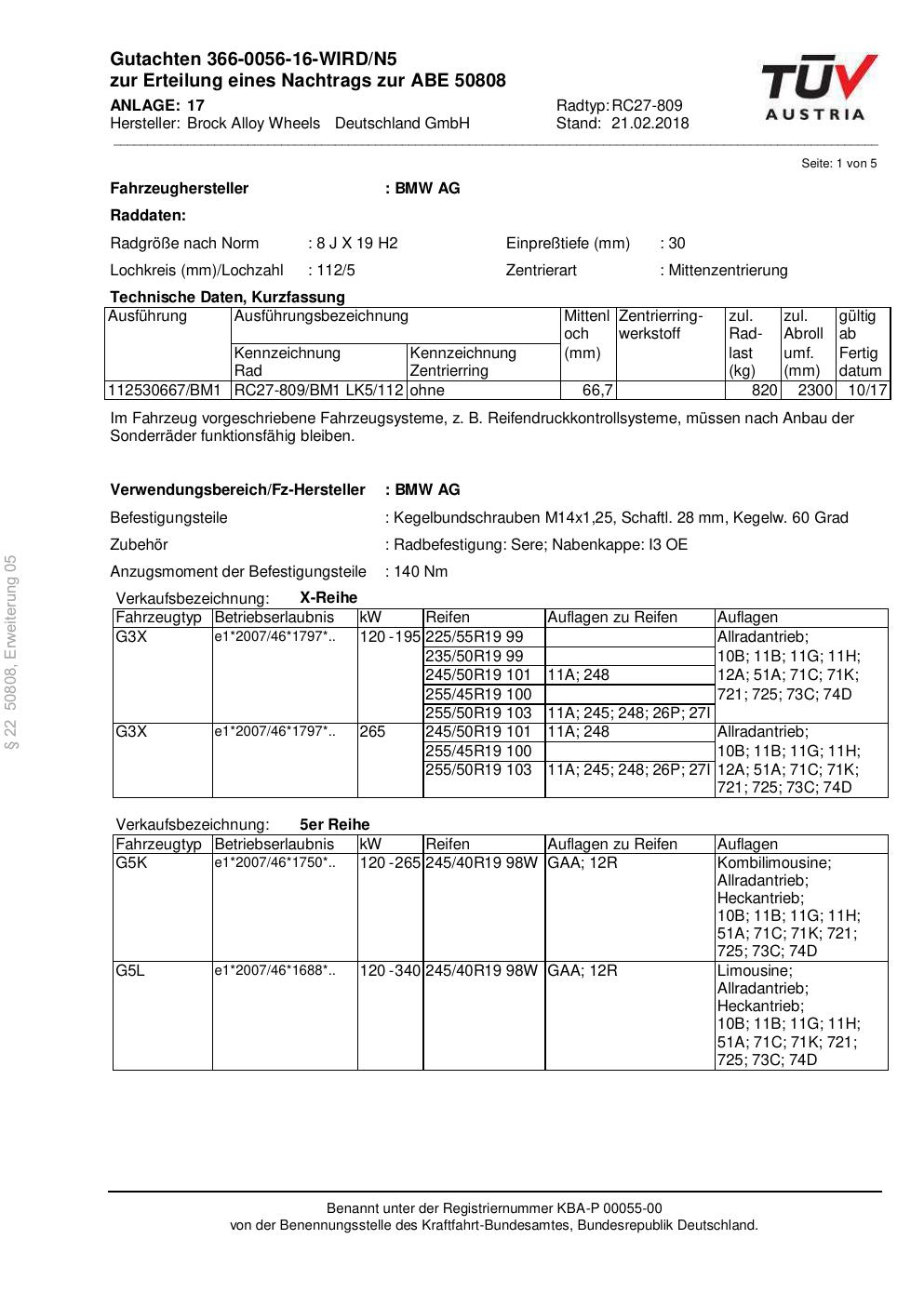 Dieses Gutachten (abe) bezieht sich auf die Alufelge Brock RC27-809 in der Ausführung 8Jx19 ET 0, Mittenloch 0 mm (KBA 50808). Im PDF findest du typischerweise zulässige Reifengrößen, Auflagen/Anbauhinweise und – je nach Dokument – Hinweise zur Eintragung.