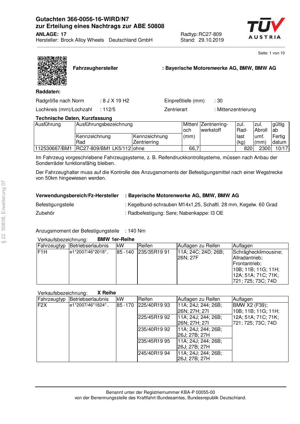 Dieses Gutachten (abe) bezieht sich auf die Alufelge Brock RC27-809 in der Ausführung 8Jx19 ET 0, Mittenloch 0 mm (KBA 50808). Im PDF findest du typischerweise zulässige Reifengrößen, Auflagen/Anbauhinweise und – je nach Dokument – Hinweise zur Eintragung.