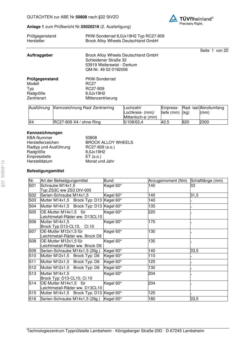Dieses Gutachten (abe) bezieht sich auf die Alufelge Brock RC27-809 in der Ausführung 8Jx19 ET 0, Mittenloch 0 mm (KBA 50808). Im PDF findest du typischerweise zulässige Reifengrößen, Auflagen/Anbauhinweise und – je nach Dokument – Hinweise zur Eintragung.