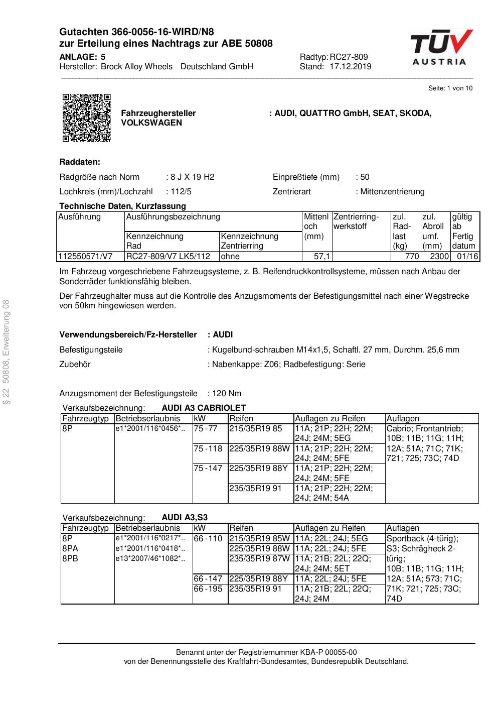 Dieses Gutachten (abe) bezieht sich auf die Alufelge Brock RC27-809 in der Ausführung 8Jx19 ET 0, Mittenloch 0 mm (KBA 50808). Im PDF findest du typischerweise zulässige Reifengrößen, Auflagen/Anbauhinweise und – je nach Dokument – Hinweise zur Eintragung.