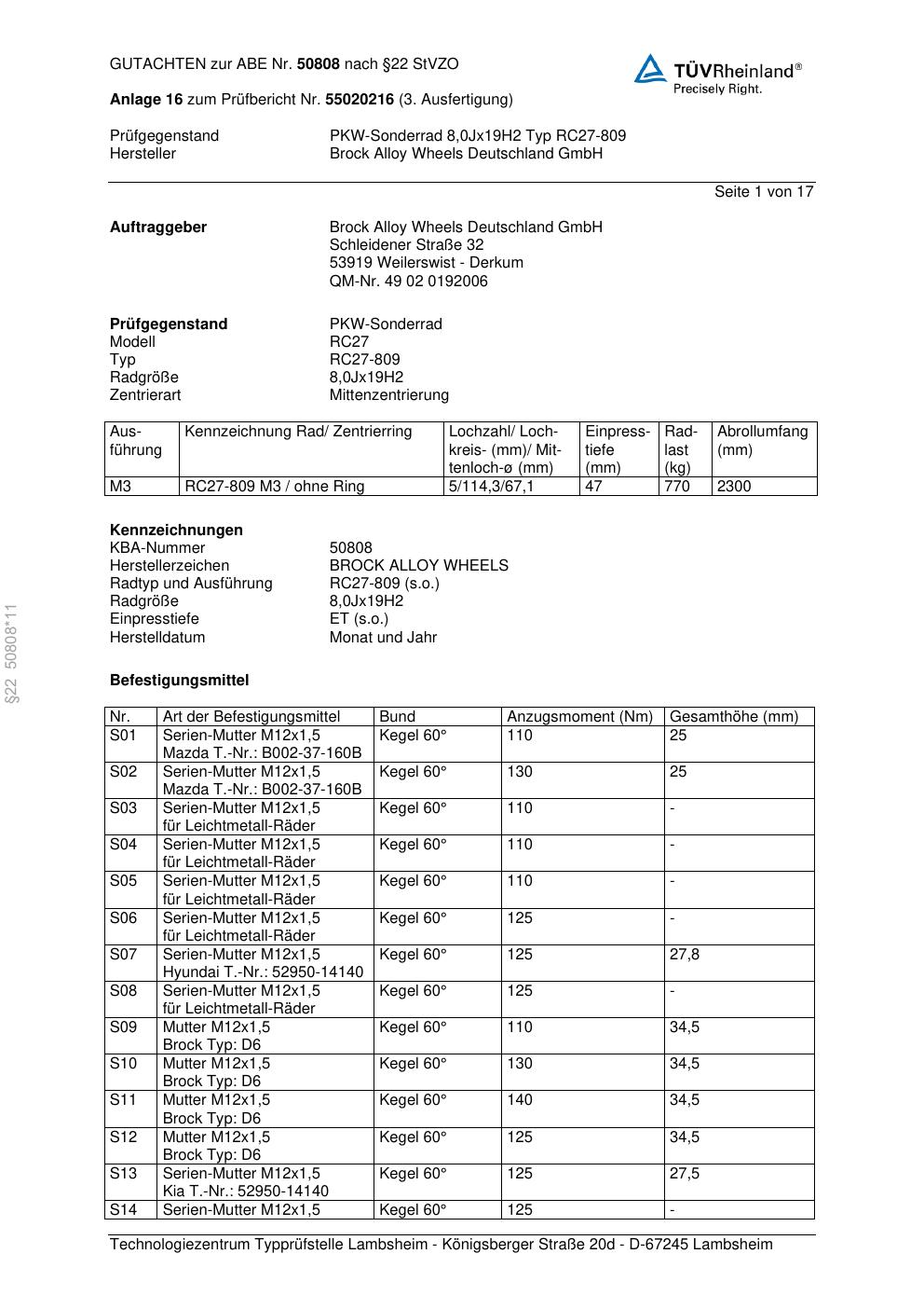 Dieses Gutachten (abe) bezieht sich auf die Alufelge Brock RC27-809 in der Ausführung 8Jx19 ET 0, Mittenloch 0 mm (KBA 50808). Im PDF findest du typischerweise zulässige Reifengrößen, Auflagen/Anbauhinweise und – je nach Dokument – Hinweise zur Eintragung.
