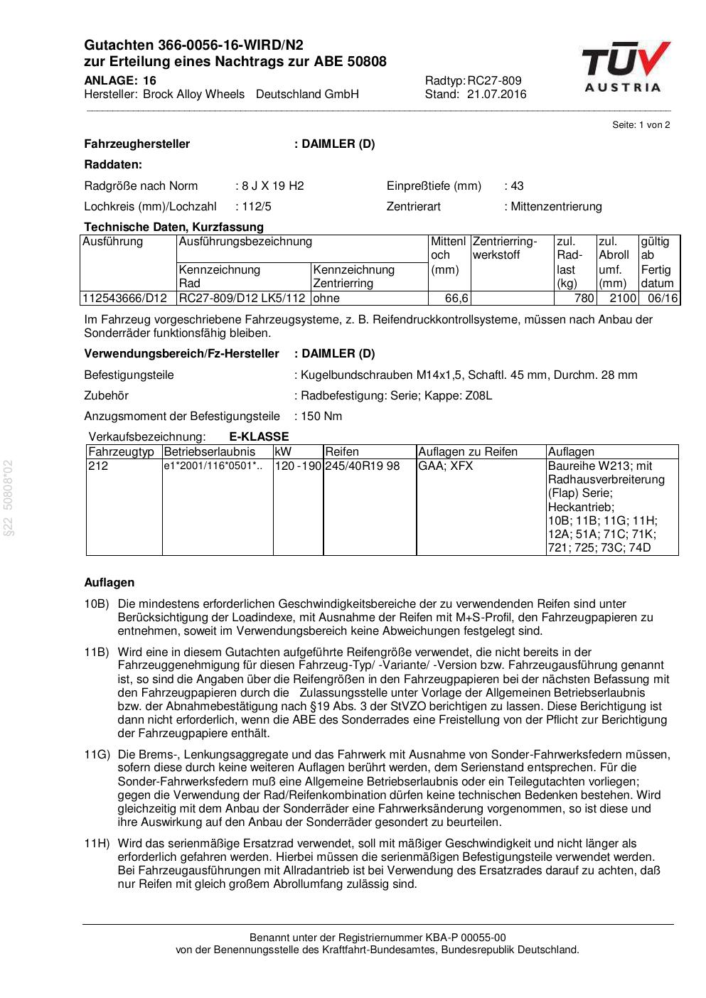 Felgengutachten / abe für Alufelgen Brock RC27-809 (8Jx19 ET 0, Mittenloch 0 mm) mit KBA 50808 (Zertifikatsnummer 50808). Hier kostenlos als PDF herunterladen. Der Download-Link ist 24 Stunden gültig und kann bis zu zwei Mal verwendet werden.