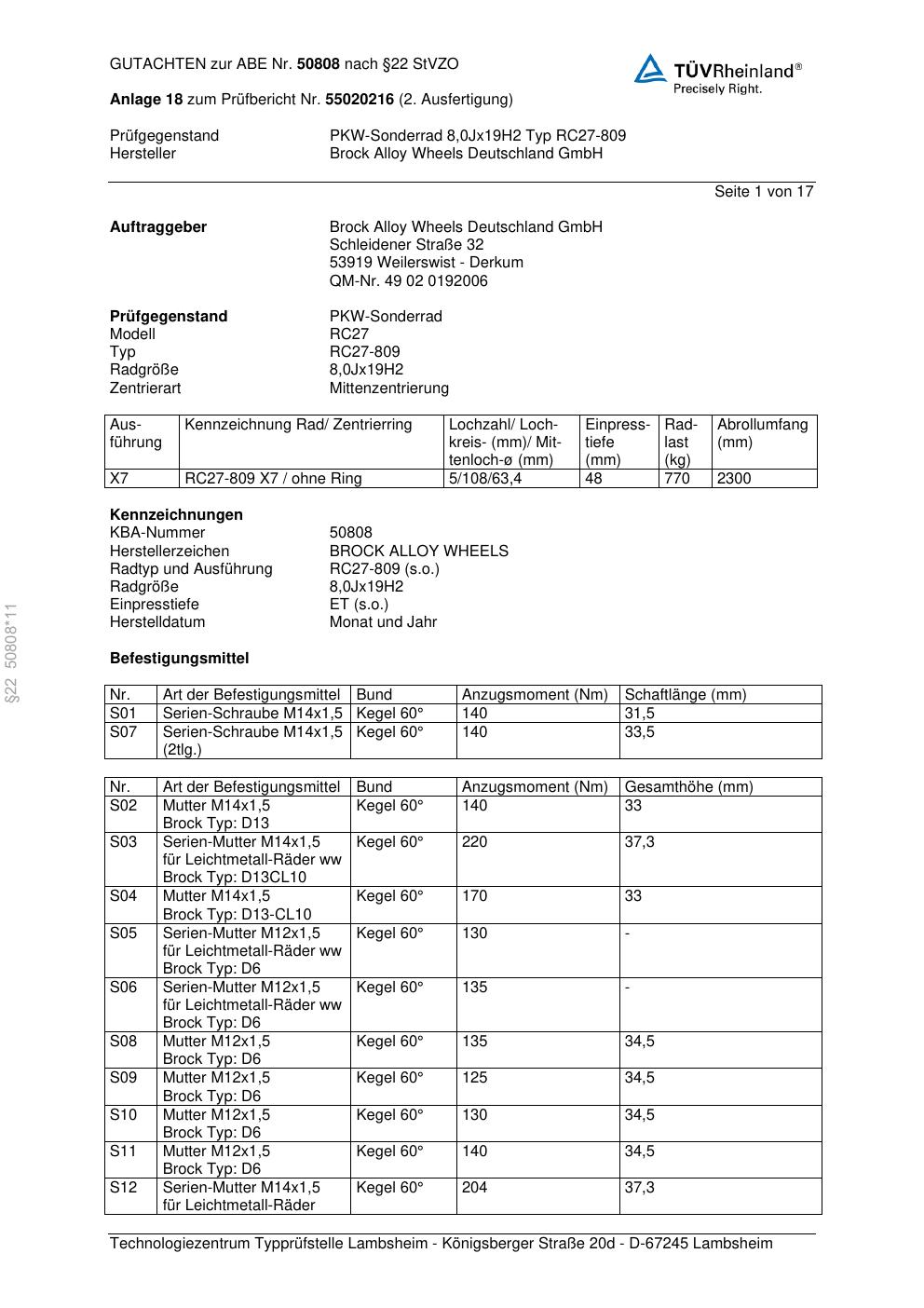 Dieses Gutachten (abe) bezieht sich auf die Alufelge Brock RC27-809 in der Ausführung 8Jx19 ET 0, Mittenloch 0 mm (KBA 50808). Im PDF findest du typischerweise zulässige Reifengrößen, Auflagen/Anbauhinweise und – je nach Dokument – Hinweise zur Eintragung.