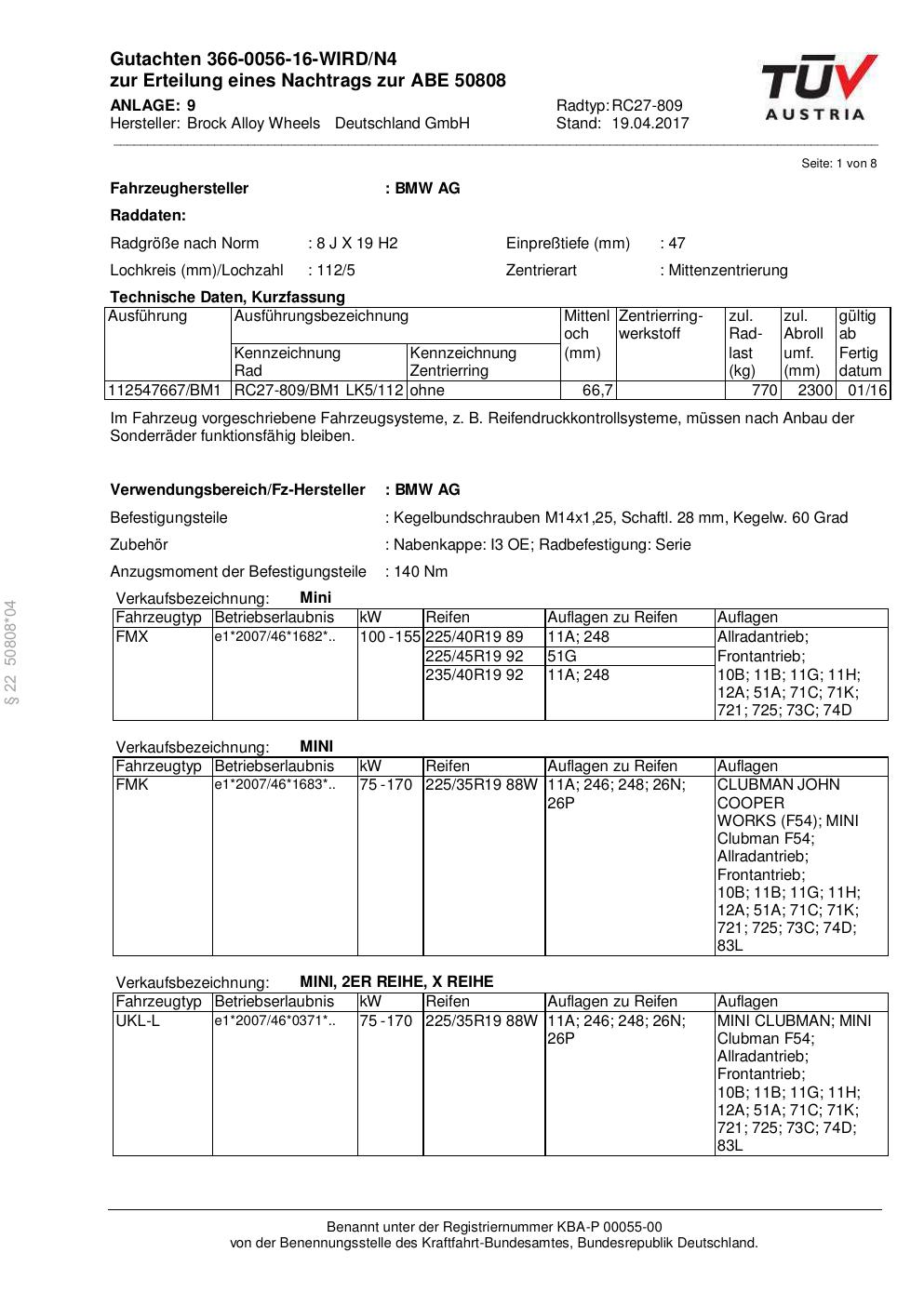 Dieses Gutachten (abe) bezieht sich auf die Alufelge Brock RC27-809 in der Ausführung 8Jx19 ET 0, Mittenloch 0 mm (KBA 50808). Im PDF findest du typischerweise zulässige Reifengrößen, Auflagen/Anbauhinweise und – je nach Dokument – Hinweise zur Eintragung.