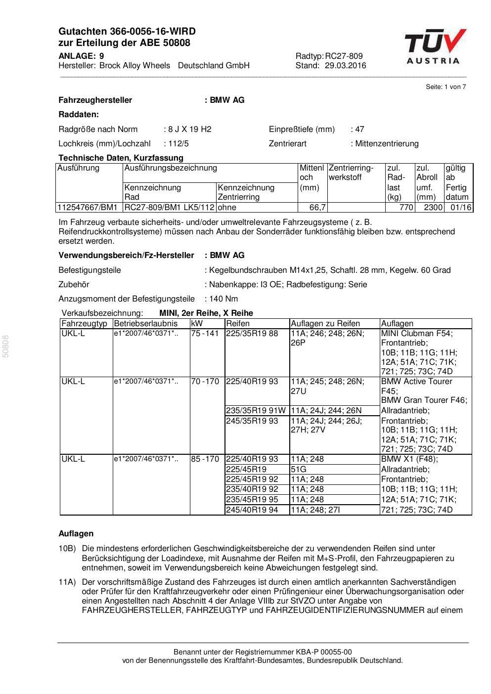 Dieses Gutachten (abe) bezieht sich auf die Alufelge Brock RC27-809 in der Ausführung 8Jx19 ET 0, Mittenloch 0 mm (KBA 50808). Im PDF findest du typischerweise zulässige Reifengrößen, Auflagen/Anbauhinweise und – je nach Dokument – Hinweise zur Eintragung.