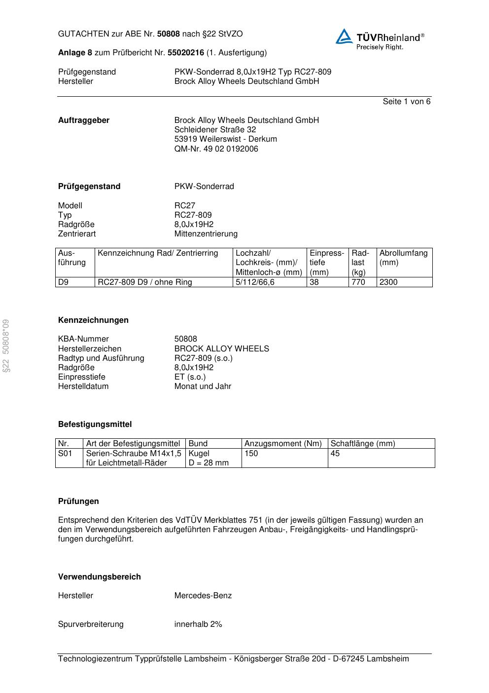 Dieses Gutachten (abe) bezieht sich auf die Alufelge Brock RC27-809 in der Ausführung 8Jx19 ET 0, Mittenloch 0 mm (KBA 50808). Im PDF findest du typischerweise zulässige Reifengrößen, Auflagen/Anbauhinweise und – je nach Dokument – Hinweise zur Eintragung.