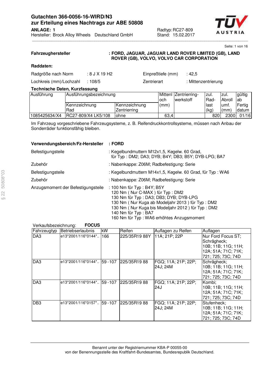 Dieses Gutachten (abe) bezieht sich auf die Alufelge Brock RC27-809 in der Ausführung 8Jx19 ET 0, Mittenloch 0 mm (KBA 50808). Im PDF findest du typischerweise zulässige Reifengrößen, Auflagen/Anbauhinweise und – je nach Dokument – Hinweise zur Eintragung.