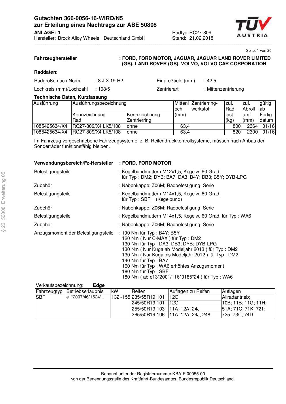 Dieses Gutachten (abe) bezieht sich auf die Alufelge Brock RC27-809 in der Ausführung 8Jx19 ET 0, Mittenloch 0 mm (KBA 50808). Im PDF findest du typischerweise zulässige Reifengrößen, Auflagen/Anbauhinweise und – je nach Dokument – Hinweise zur Eintragung.