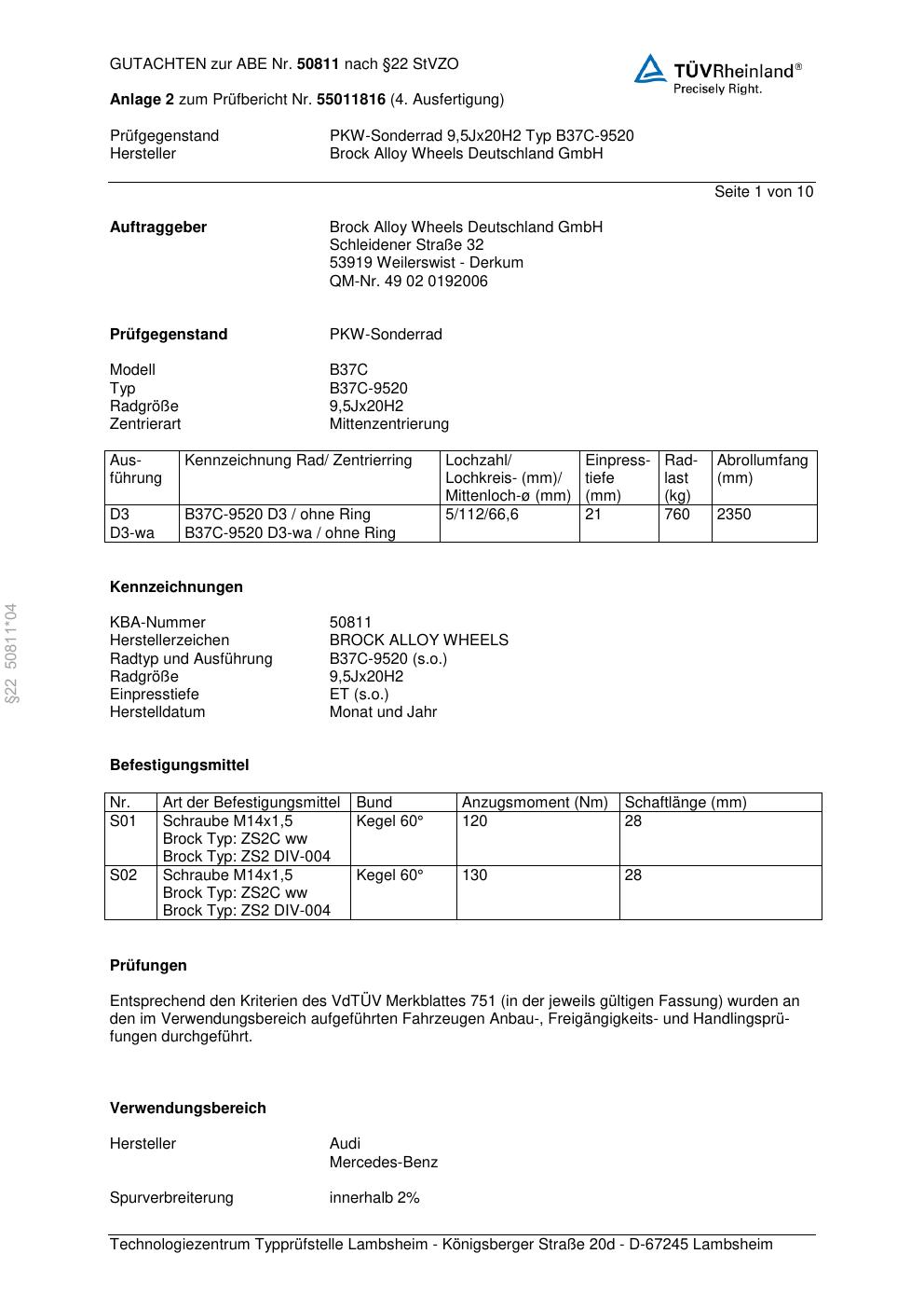 Dieses Gutachten (abe) bezieht sich auf die Alufelge Brock B37C-952 0 in der Ausführung 9.5Jx2 ET 0, Mittenloch 0 mm (KBA 50811). Im PDF findest du typischerweise zulässige Reifengrößen, Auflagen/Anbauhinweise und – je nach Dokument – Hinweise zur Eintragung.