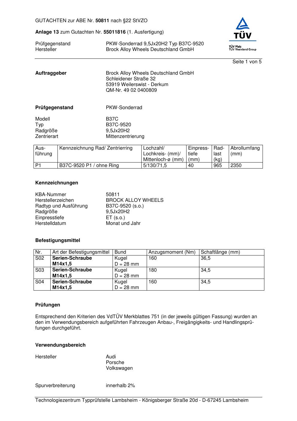 Dieses Gutachten (abe) bezieht sich auf die Alufelge Brock B37C-952 0 in der Ausführung 9.5Jx2 ET 0, Mittenloch 0 mm (KBA 50811). Im PDF findest du typischerweise zulässige Reifengrößen, Auflagen/Anbauhinweise und – je nach Dokument – Hinweise zur Eintragung.