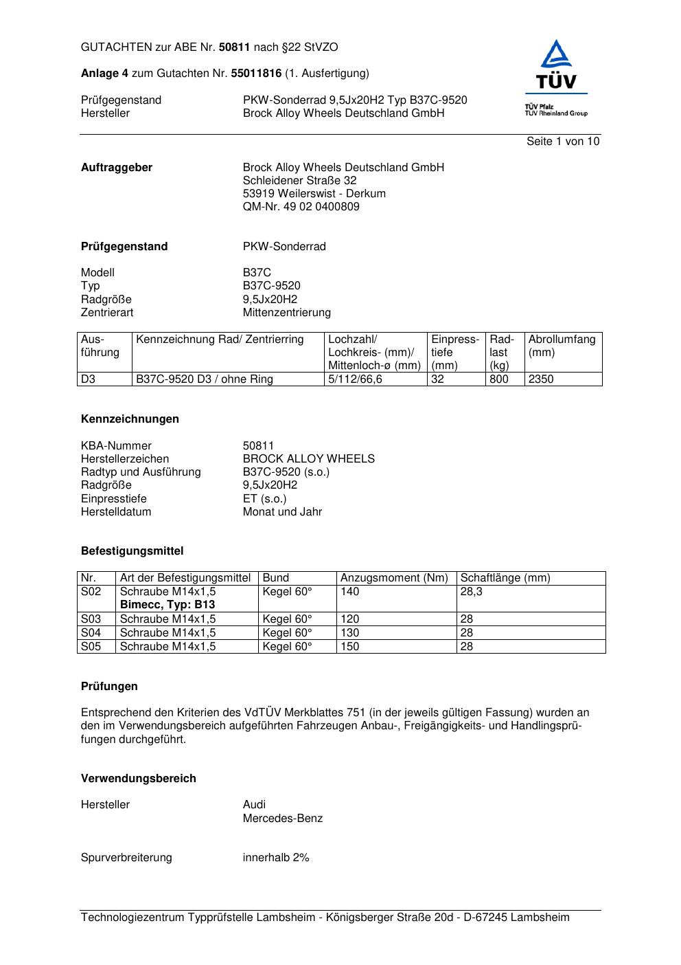 Dieses Gutachten (abe) bezieht sich auf die Alufelge Brock B37C-952 0 in der Ausführung 9.5Jx2 ET 0, Mittenloch 0 mm (KBA 50811). Im PDF findest du typischerweise zulässige Reifengrößen, Auflagen/Anbauhinweise und – je nach Dokument – Hinweise zur Eintragung.