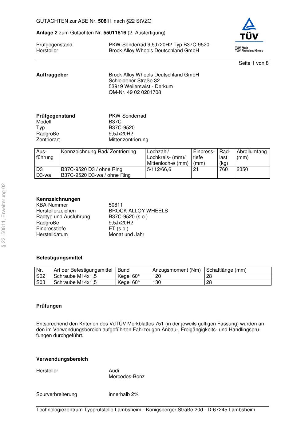 Dieses Gutachten (abe) bezieht sich auf die Alufelge Brock B37C-952 0 in der Ausführung 9.5Jx2 ET 0, Mittenloch 0 mm (KBA 50811). Im PDF findest du typischerweise zulässige Reifengrößen, Auflagen/Anbauhinweise und – je nach Dokument – Hinweise zur Eintragung.