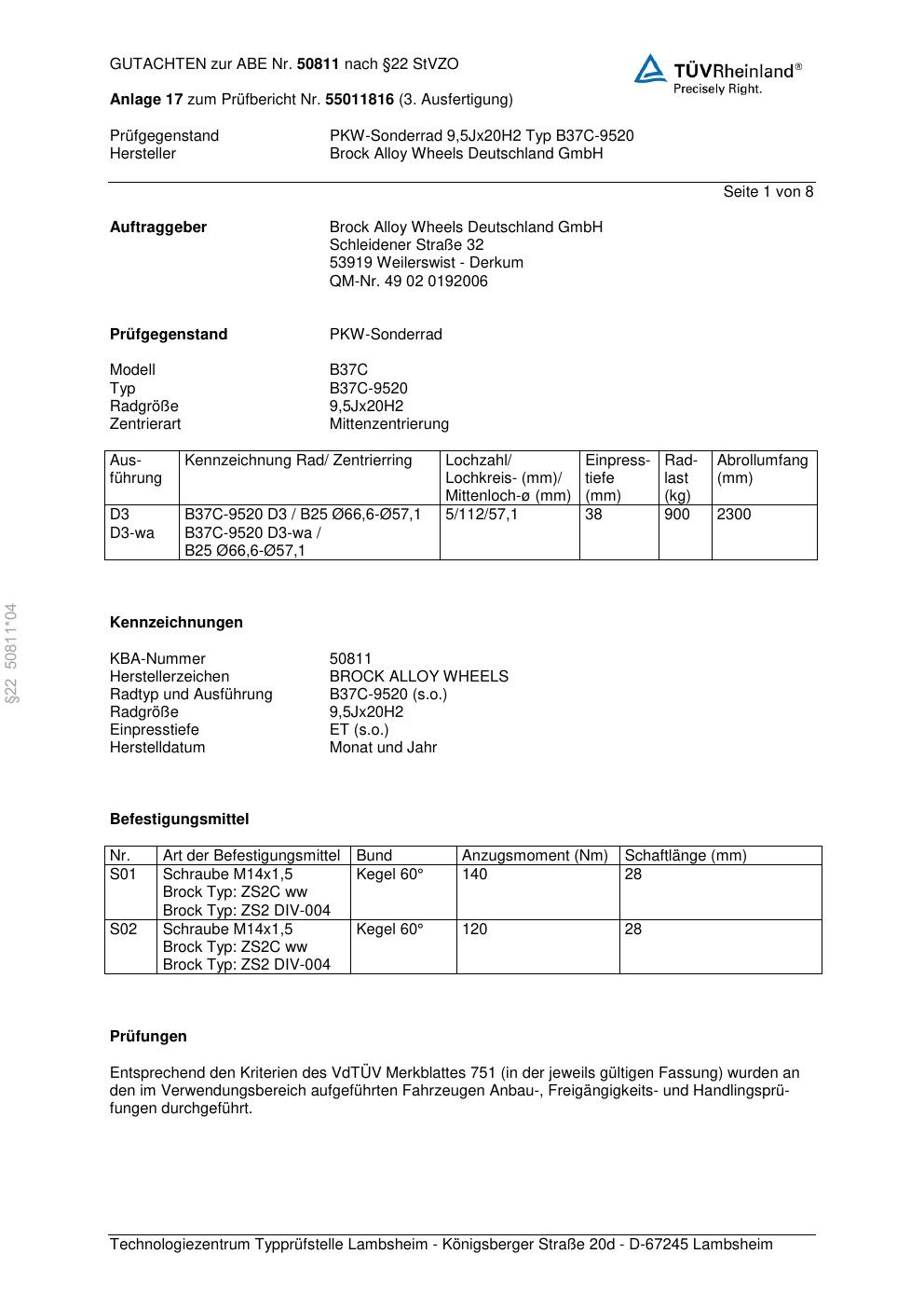 Dieses Gutachten (abe) bezieht sich auf die Alufelge Brock B37C-952 0 in der Ausführung 9.5Jx2 ET 0, Mittenloch 0 mm (KBA 50811). Im PDF findest du typischerweise zulässige Reifengrößen, Auflagen/Anbauhinweise und – je nach Dokument – Hinweise zur Eintragung.