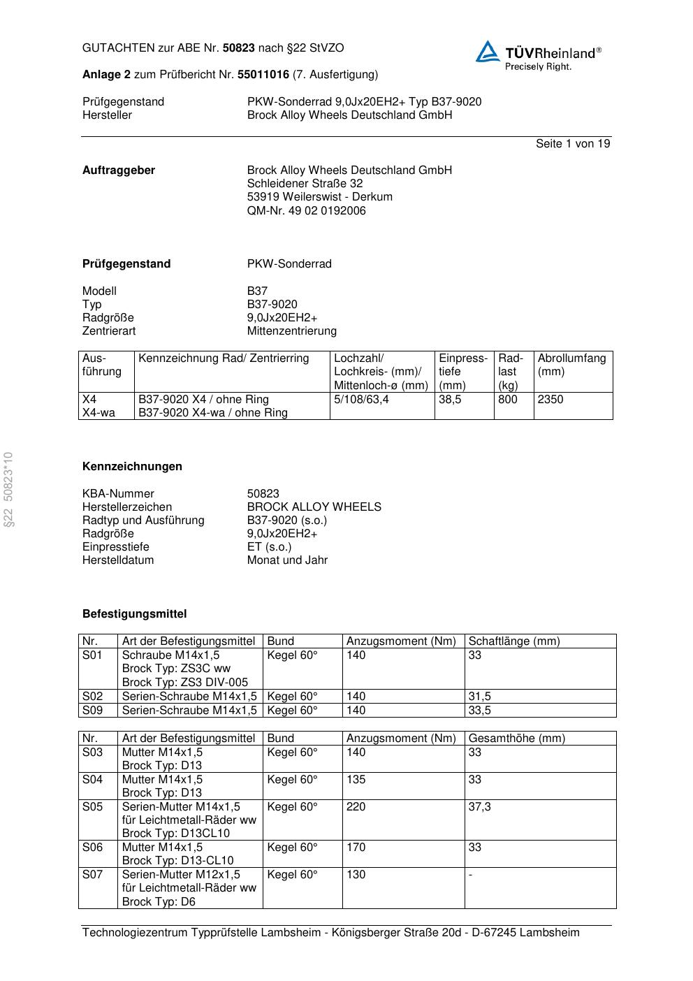 Dieses Gutachten (abe) bezieht sich auf die Alufelge Brock B37-90 20 in der Ausführung 8.5Jx21 ET 0, Mittenloch 0 mm (KBA 50823). Im PDF findest du typischerweise zulässige Reifengrößen, Auflagen/Anbauhinweise und – je nach Dokument – Hinweise zur Eintragung.