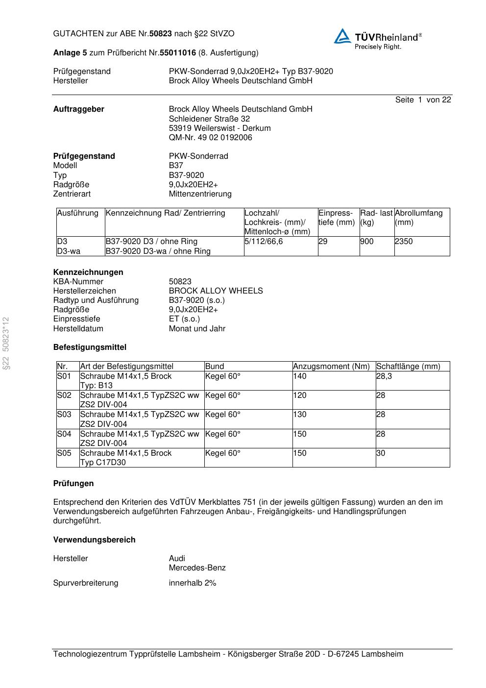 Dieses Gutachten (abe) bezieht sich auf die Alufelge Brock B37-90 20 in der Ausführung ET 0, Mittenloch 0 mm (KBA 50823). Im PDF findest du typischerweise zulässige Reifengrößen, Auflagen/Anbauhinweise und – je nach Dokument – Hinweise zur Eintragung.