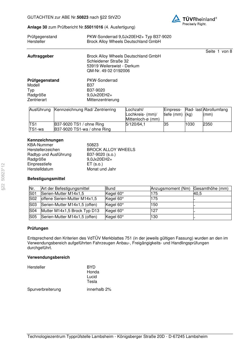Dieses Gutachten (abe) bezieht sich auf die Alufelge Brock B37-90 20 in der Ausführung ET 0, Mittenloch 0 mm (KBA 50823). Im PDF findest du typischerweise zulässige Reifengrößen, Auflagen/Anbauhinweise und – je nach Dokument – Hinweise zur Eintragung.