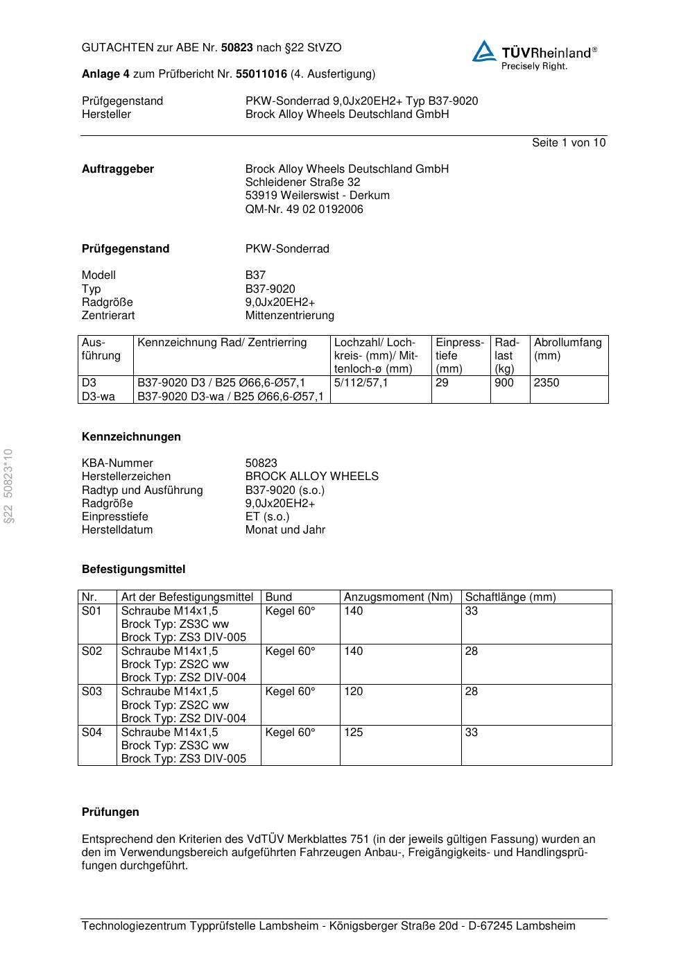 Dieses Gutachten (abe) bezieht sich auf die Alufelge Brock B37-90 20 in der Ausführung 8.5Jx19 ET 0, Mittenloch 0 mm (KBA 50823). Im PDF findest du typischerweise zulässige Reifengrößen, Auflagen/Anbauhinweise und – je nach Dokument – Hinweise zur Eintragung.