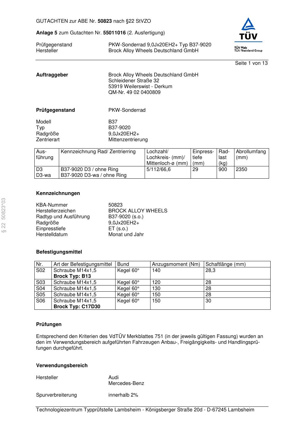 Dieses Gutachten (abe) bezieht sich auf die Alufelge Brock B37-90 20 in der Ausführung ET 0, Mittenloch 0 mm (KBA 50823). Im PDF findest du typischerweise zulässige Reifengrößen, Auflagen/Anbauhinweise und – je nach Dokument – Hinweise zur Eintragung.