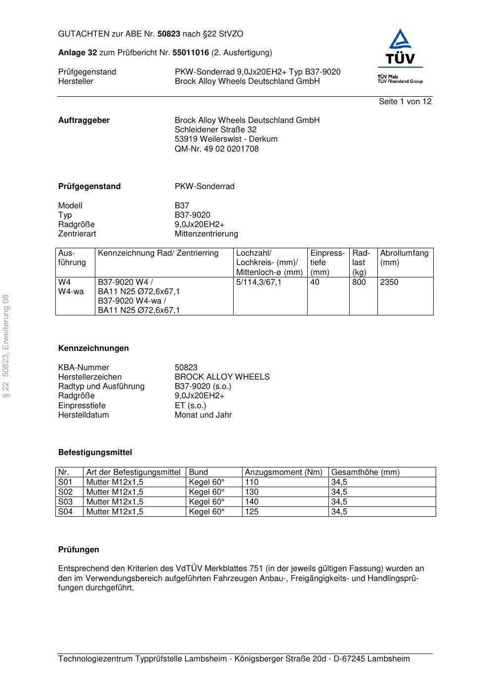 Dieses Gutachten (abe) bezieht sich auf die Alufelge Brock B37-90 20 in der Ausführung 6Jx67 ET 0, Mittenloch 0 mm (KBA 50823). Im PDF findest du typischerweise zulässige Reifengrößen, Auflagen/Anbauhinweise und – je nach Dokument – Hinweise zur Eintragung.