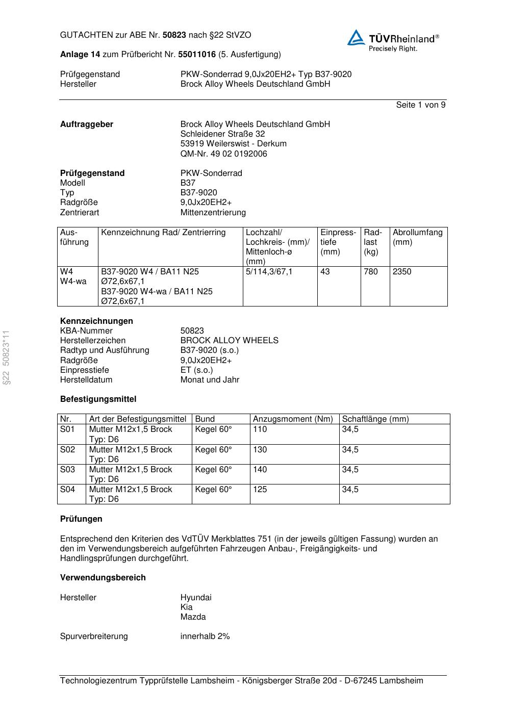 Felgengutachten / abe für Alufelgen Brock B37-90 20 (6Jx67 ET 0, Mittenloch 0 mm) mit KBA 50823 (Zertifikatsnummer 50823). Hier kostenlos als PDF herunterladen. Der Download-Link ist 24 Stunden gültig und kann bis zu zwei Mal verwendet werden.